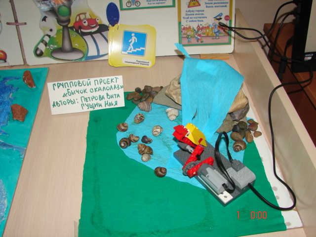 Так, в рамках группового проекта создаем проекты с использованием роботов из конструктора Lego Education. Для создания таких проектов в группе создан центр юного инженера. В этом центре из конструктора Lego Education собираем роботов и программируем его действия на моноблоке в программе визуального программирования Lego WeDo 1.0. Например, в рамках проекта «Горы России и их сокровища» создали проект «Бычок-скалолаз». Для данного проекта в центре юного инженера изобрели робота бычка-скалолаза, запрограммировали его действия. После авторы проекта представили его другим детям.