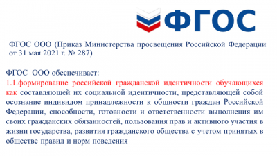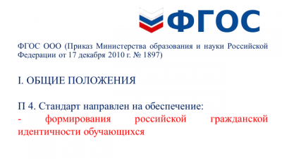 В свое время в «Концепции духовно-нравственного развития и воспитания личности гражданина России» подчеркивалось, что «ступень российской гражданской идентичности – это высшая ступень процесса духовно-нравственного развития личности россиянина, его гражданского, патриотического воспитания». Это положение нашло отклик в Историко-культурном стандарте, где «одной из главных задач школьного курса истории является формирование гражданской общероссийской идентичности». В обновленном ФГОС, в отличие от ФГОС, утвержденном в декабре 2010 года, понятие российской гражданской идентичности значительно расширено, что дает возможность определить основные направления для реализации воспитательных задач на уроках истории: