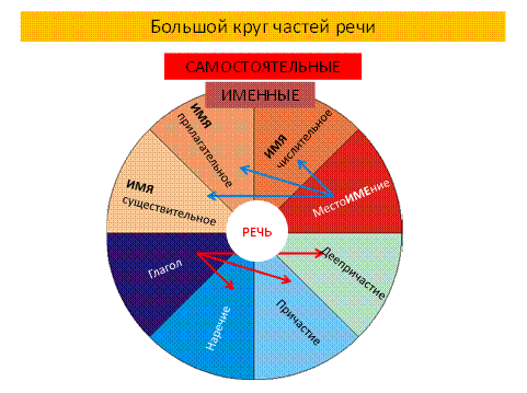 На этой схеме четко видно, что вся наша РЕЧЬ поделилась на 8 частей. Отсюда и название ЧАСТЬ РЕЧИ. (Кстати, многие взрослые, не говоря уже о детях, даже не задумываются, откуда такое название – ЧАСТЬ РЕЧИ. Всегда делаю на этом акцент, чтобы этот термин был осмысленным, а не произносился на автомате). В большом кругу частей речи располагаются 8 самостоятельных: ИМЯ существительное, ИМЯ прилагательное, ИМЯ числительное, местоимение, глагол, наречие, причастие и деепричастие. Первые четыре входят в «красный» полукруг – они именные. Местоимение – часть речи, которая легко заменяет собою (занимает МЕСТО) все ИМенные части речи. Отсюда и ее название – вместо имени. Вторая, «синяя», четвёрка, так или иначе, связана с глаголом. «Синий» полукруг – это части речи, связанные с глаголом. Наречие обозначает в большинстве случаев признак действия (глагола), причастие и деепричастие образованы от глагола и имеют схожие с ним морфологические признаки.