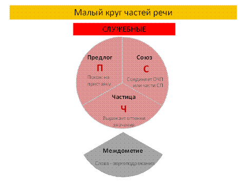 Эта схема очень хорошо работает на разных уровнях: дети запоминают количество самостоятельных (8) и служебных (3) частей речи, зрительно представляют себе разного цвета круги, овладевают терминами (самостоятельные (большой круг), служебные (малый круг), именные части речи). В детских конспектах воспроизведены такие же схемы.