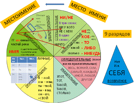 Отдельная тема – это местоимение. Большую сложность вызывает запоминание всех разрядов этой части речи. И здесь очень помогает еще один круг. Всегда отвожу большую роль осознанному пониманию названия разряда.