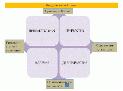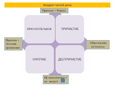 И квадрат, состоящий из 4 частей речи и объединяющий самые тяжело усваиваемые части речи, призван систематизировать знания о прилагательном, наречии, причастии и деепричастии. Из этого квадрата вычленяется информация: какие общие и различные признаки имеют эти части речи: