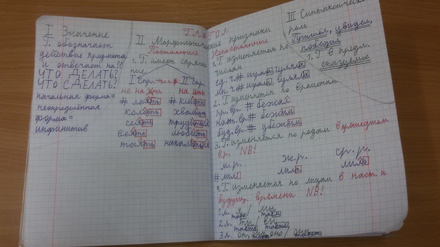 Исходя из этого, оформляем «СЦЕНУ»: в первых «кулисах» – значение, во вторых «кулисах» – синтаксическая роль. А на самой «сцене» – выступают морфологические признаки (грамматические категории), четко поделенные сгибом тетради на постоянные и непостоянные.
