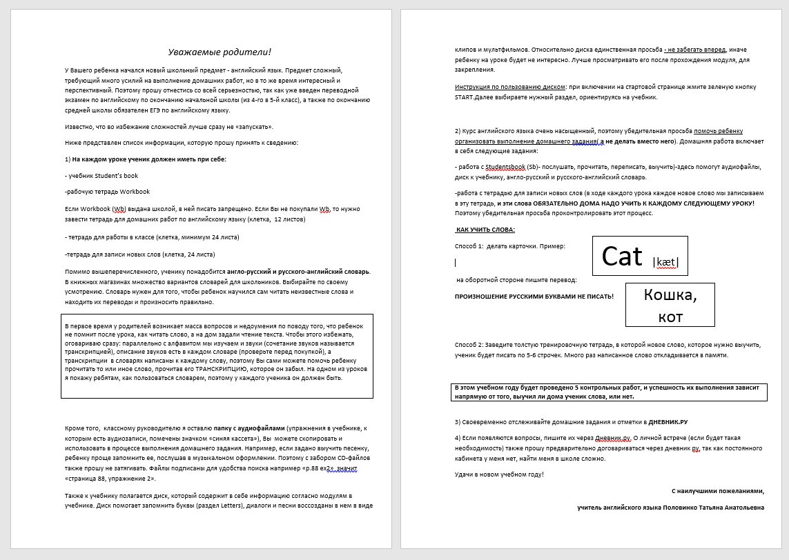 Целью данной статьи является описание способа информирования родителей в формате классного часа в отношении проведения уроков английского языка в среднеобразовательной школе, избавление участников образовательного процесса от страха изучения нового предмета, обозначение вектора изучения иностранного языка и формирование позитивного отношения к предмету «английский язык».
