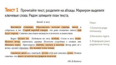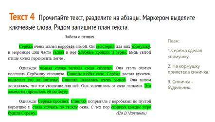 При формировании тестовых умений на уроках русского языка также можно использовать Google Slides. Группам обучающихся предлагаются разные сплошные тексты. Задача учеников – разделить свой текст на абзацы (при помощи кнопки Enter), выделить маркером ключевые слова каждого абзаца и составить план текста.