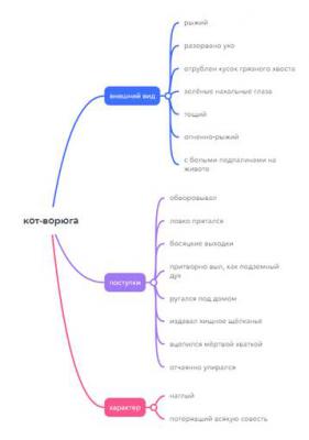 Ментальные карты очень эффективно используются, например, при характеристике героя литературного произведения. Характеризуя кота из рассказа К. Г. Паустовского «Кот-ворюга», дети создали вот такую ментальную карту.