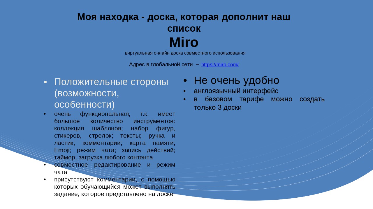 Планирование выступления на МО «Организация продуктивного взаимодействия в образовательном процессе с использованием онлайн-досок» выполнили в виде презентации. Сравнили предложенные онлайн-доски. Их тоже большое количество. Для знакомства автором предложена онлайн-доска Miro.