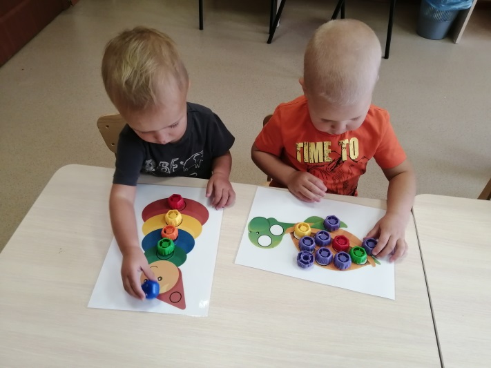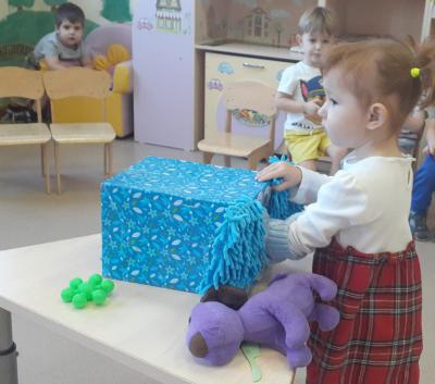 Не оставляем без внимания и тактильные ощущения, для упражнений используем различные предметы и дидактические пособия. В этом нам помогают сенсорные коробочки и ящик ощущений с морскими обитателями, с любимыми персонажами из мультфильмов. Игры с волшебным мешочком и игры с предметами, которые можно нанизывать на шнурок, а также массажные мячики (ежики), мелкие игрушки, прищепки, крышки, пластилин и многое другое. Дети с удовольствием и интересом играют в такие игры, а после показа и объяснений играют самостоятельно. У ребят уже появились любимые игры: «Повесь белье на сушилку», «Разложи крышки по цвету», «Веселый клоун», «Найди мышку», «Помоги рыбке спрятаться» и другие.