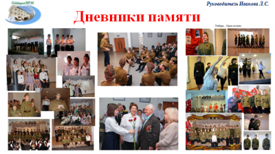 «Мы воскрешаем события Великой Отечественной войны, проживая на сцене, будто в реальности, судьбы своих сверстников», – говорят ребята и называют свои спектакли «ДНЕВНИКОМ ПАМЯТИ», потому что тема Памяти – основа всех сценических постановок. Учителя и ученики, независимо от национальности и вероисповедования, становятся единоверцами в осмыслении пережитого горя советским народом в суровые годы войны. В последние годы, завершая свое выступление, ребята с гордостью поднимают фотографии своих прадедов, прошедших горнило войны, таким образом, благодаря клубу «Россияне» и Людмиле Сергеевне Ивановой в нашей гимназии появился свой «Бессмертный полк»!