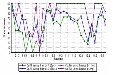 Средний процент выполнения заданий разными группами участников (смотри рис. 1) только подтверждает вышеуказанные факты – для всех групп участников оказались трудными задания 5, 7, 13, 14.