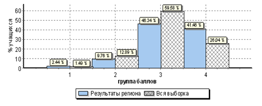 Три участника (75 %), претендующих на вхождение в региональный методический актив, прошли оценку успешно. Распределение учителей химии по результатам оценки предметных и методических компетенций представлены в таблице 1. Статистика распределения в сравнении с выборкой по Российской Федерации представлена на рисунке 1.