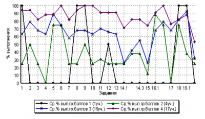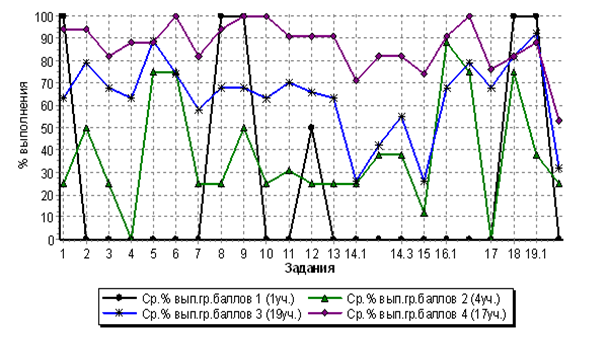 Анализ результативности выполнения заданий группами участников исследования (Рис. 2) показал, что для группы учителей, выполнивших работу на 80 % и более (высокий уровень) наиболее сложными оказались из предметной части уже обозначенные выше задания 3 и 7, из методической части работы – также отмеченные ранее задания 19, 14.1.