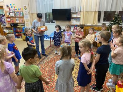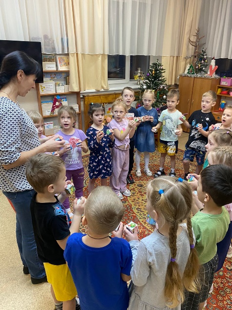Дети отгадывают загадку и находят подарок от деда Мороза.