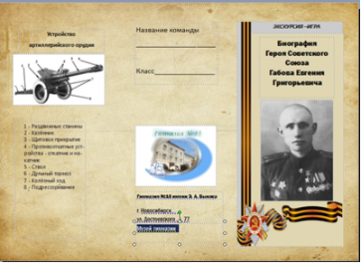 1 интерактивный момент. «С июня 1942 года Евгений Григорьевич на Сталинградском фронте. Обороняя Сталинград, 18 сентября 1942 года Евгений Габов был тяжело ранен и отправлен в госпиталь. В музее нашей гимназии хранится каска с тех времен. И на ней есть отверстие, которое похоже на след от пули. Каску не только использовали по прямому назначению.