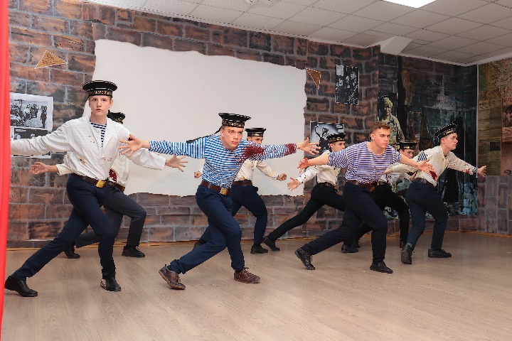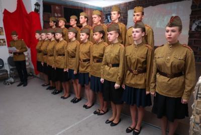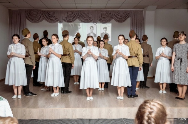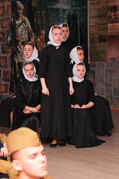 Юноши и девушки в одеждах 41 года выходят на сцену