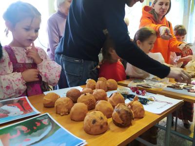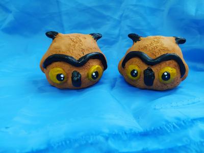 Мотивационным предварением созидательного труда стал рассказ о деятельности Новосибирского центра реабилитации хищных птиц, об организации ярмарки в помощь Центру. Детям было предложено слепить из глины два абсолютно одинаковых сувенира символа Центра – один для себя, второй для реализации на благотворительной ярмарке. На экране проецировались фотоизображения птенцов сов разных видов, обсуждались с детьми их особенности: форма тела, цвет, расположение глаз и т.д. Мы вспомнили о двух способах изображения: реалистичном и стилизованном – и решили, что для данных сувениров подходит стилизованный метод изображения.