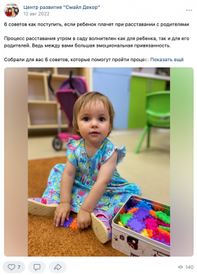Таким образом, паблик является не только площадкой для коммуникации, но и медиаобразовательной лабораторией. Изучая контент паблика, можно не только посмотреть на оснащение центра, но и увидеть работу педагогов и воспитателей. Также можно почитать отзывы других родителей или самостоятельно найти среди подписчиков тех, у кого можно этот отзыв получить. Паблик помогает наладить общение с новой целевой аудиторией и укрепить связи с теми, кто уже пользуется услугами центра. Объединяющим моментом является просветительский контент, который отвечает на запросы «ответственного родительства».