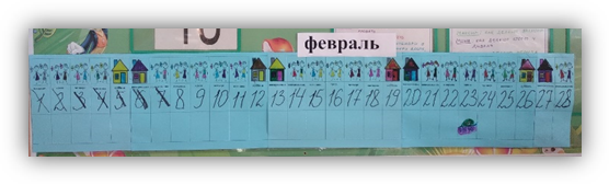 Для понимания и закрепления течения времени у детей авторы программы рекомендуют системную ежедневную работу с линейным календарем. Количество вопросов – не более 5-ти и их содержание не должно быть однообразным. Так, например, сколько дней осталось до выходных, до какого-либо праздника или события, сколько дней уже прожили в данном месяце, сколько дней прошло с начала недели и т. д.