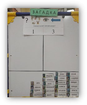 В нашей группе отгадать загадку детям предлагается утром, сразу после прихода в детский сад. Данная деятельность разворачивается на специально отведенном для этого мольберте. Таким образом, мы обеспечиваем мобильность предлагаемой загадки. Она может оказаться как в приемной, в группе, так и за их пределами. На мольберте размещено непосредственно задание – вопрос, иллюстрирующая его картинка, варианты ответов, а также карточки с фотографиями и именами детей.