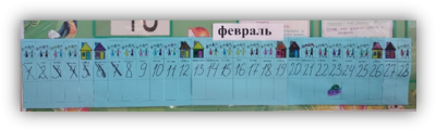 Программа «ПРОдетей» включает в себя еще и такую методику, как «Линейный календарь». Он представляет собой ленту, символизирующую временной отрезок, равный одному месяцу. В верхней его части находятся символы, обозначающие рабочие и выходные дни недели. Данные символы выбираются произвольно, но обязательно в результате совместного обсуждения с детьми на общем сборе. В нашем случае – это изображения мальчика и девочки (рабочие будни) и домиков – суббота и воскресенье. Наряду с символическим обозначением дней недели на календаре также обязательно наличие их буквенных названий. В центральной части располагаются числа – даты соответствующего месяца. Внизу мы отмечаем значимые для нас события, социальные даты: дни рождения детей, праздники и т. д. Дети принимают активное участие в изготовлении линейного календаря: раскрашивают символы, обводят даты, изображают важные события.