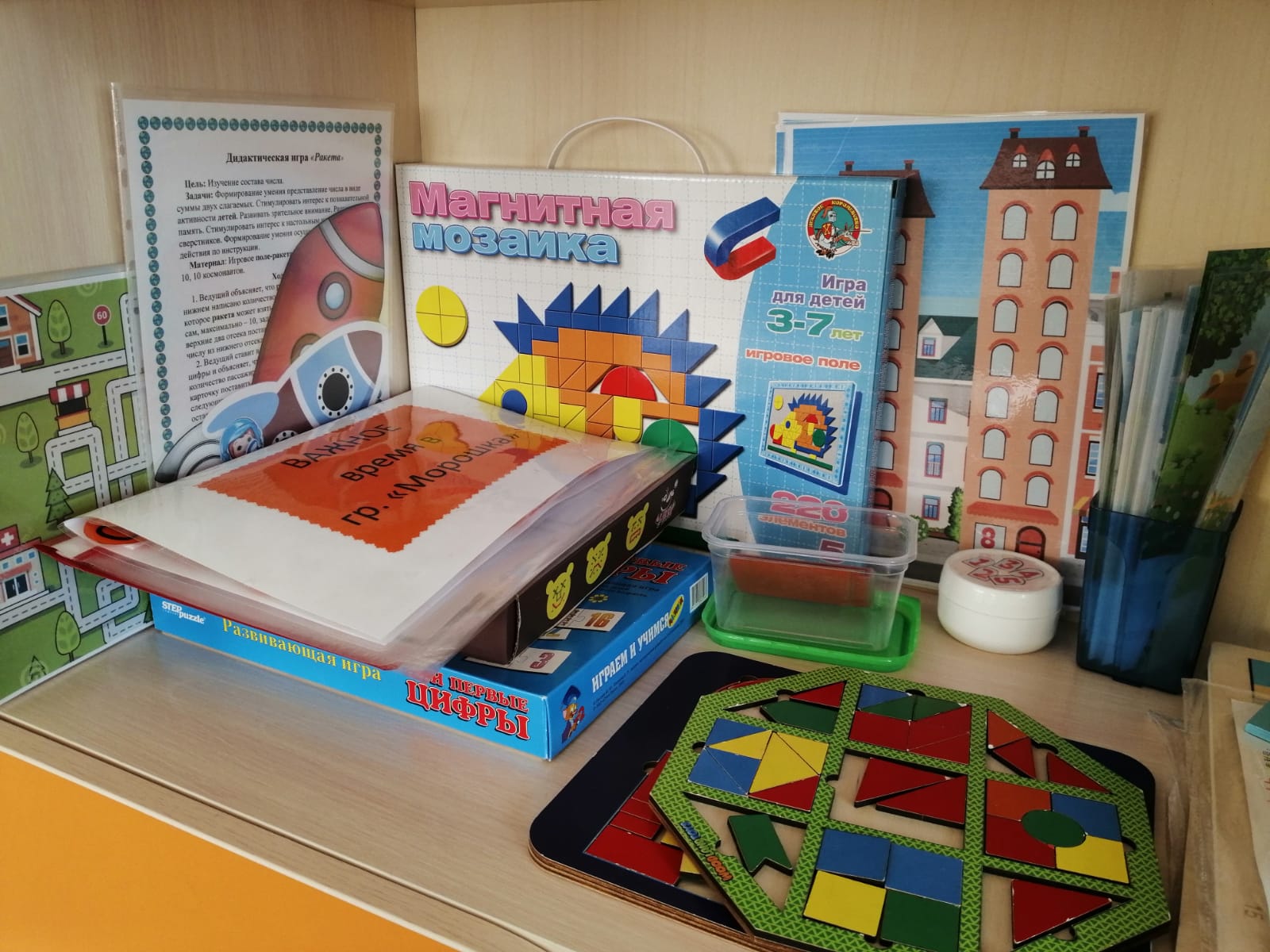 Для него был подобран различный демонстрационный и раздаточный материал для обучения детей счету, знакомству с понятиями «величина» и «форма»: