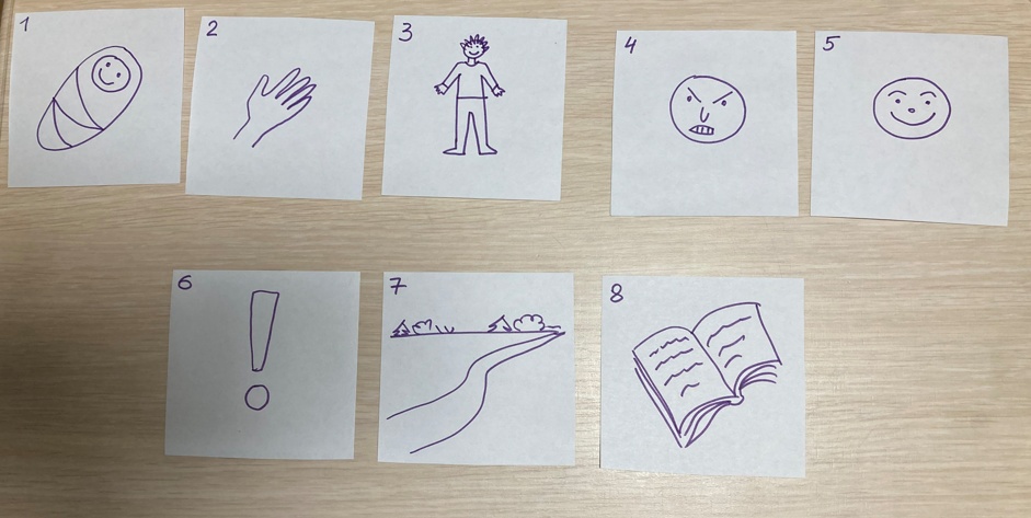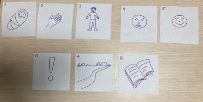 С оставшимися детками мы перешли к сочинению сказочных текстов, так как, по словам К. С. Станиславского, «надо уметь правильно произносить звуки, слова, фразы. Научившись этому так, чтобы все это вошло в привычку, – можно творить». Читая и анализируя сказки вместе с детьми, мы находим закономерности: начинаются народные, а часто и авторские сказки традиционно: «жили-были», «давным-давно», «в тридевятом царстве», а далее мы выделяем схему-алгоритм, основываясь на материалах методического комплекса «Я познаю мир». Для опоры я вместе с детьми придумала и нарисовала карточки-схемы каждого пункта (фото 8).