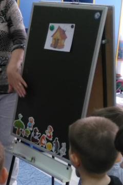 Первая задача: привлечь к коллективной речевой деятельности детей всех уровней речевого и интеллектуального развития. Для реализации этой задачи единственно верным для меня оказалось решение использовать народные кумулятивные сказки, так как они имеют мощный эмоциональный подтекст, а также способствуют многократному повторению простых понятных для детей фраз и несложных рифмованных образований. Здесь лучше всего подходят русские народные сказки «Теремок», «Колобок», «Репка», «Три медведя», «Петушок и бобовое зернышко». В этой деятельности я использовала материалы Н.З. Бакиевой «Развитие фразовой речи с помощью логосказок». Особенность технологии заключается в следующем: каждая простая сказка обыгрывается с группой детей при помощи разного дидактического материала. Сначала можно использовать кукольный театр бибабо – воспитанники воспринимают театрализованные сказки наиболее эмоционально, куклы довольно крупные, и дети их хорошо видят. В следующий раз можно эту же сказку обыграть с помощью настольного театра (игрушки, стаканчики или коробочки с изображениями персонажей сказки), магнитный театр (фото 1) является переходным этапом от театрализованной деятельности к пересказу сказок по опорным картинкам.