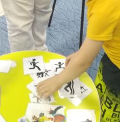 Еще одна задача, которую мне пришлось решать, это правильное формирование фразы. Для ее реализации я использую свое авторское пособие «Фразы и предложения», а также пиктограммы для обозначения слов-действий (фото 5). Сначала составляются словосочетания с использованием одного объекта, а карточка-действие меняется для каждого ребенка. Мы называем это «читать», и воспитанникам это очень нравится. Когда дети усваивают данную систему «чтения», они сами выбирают другую карточку-действие для своих товарищей (фото 6). Это участие в процессе активизирует мыслительную деятельность детей и логическое мышление. Например, если объект «рыбка», ему нельзя поставить действие «бежит» или «летит». При использовании в коллективной деятельности такой игровой цепочки также хорошо концентрируется внимание тех детей, которые в данный момент ждут своей очереди «читать». На следующем этапе ребенок может заменить в словосочетании любое слово (объект или действие) или оба сразу. Детей этот процесс затягивает, им нравится формировать новую фразу. После того как фраза из двух слов «читается» и составляется воспитанниками быстро и легко, в игру вводится третий элемент – признак. Пиктограммы признаков очень удобно заимствовать из методического комплекса «Я познаю мир» Т. А. Сидорчук, основанного на технологиях ТРИЗ-ОТСМ-РТВ, дети их быстро запоминают и легко используют в совместной и самостоятельной деятельности.