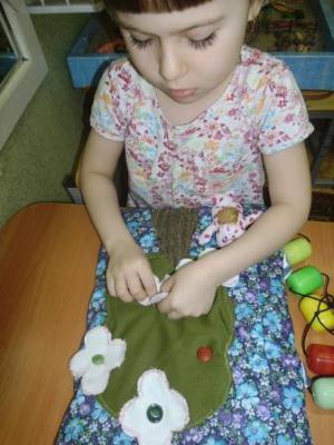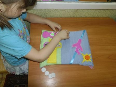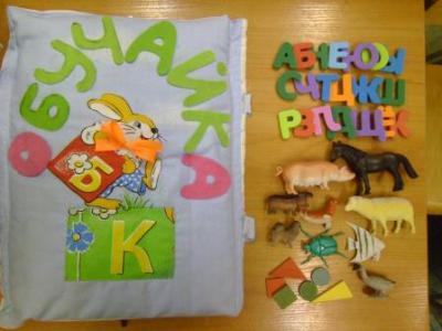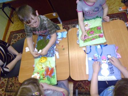 Тактильная книга «Обучай-ка» делится на две части: дидактическую и ассоциативную. Дидактическая часть имеет тематическую, коррекционно-обучающую направленность и решает задачи по формированию фонетико-фонематических процессов. Работа по формированию фонематического восприятия в самом начале осуществляется на материале неречевых звуков (на материале сказки «Теремок») Сначала дети вслушиваются, какие звуки слышны из теремка, где никто не живет. Затем дети имитируют голос героя, который подходит к теремку. На следующих занятиях с книгой дети, играя, учатся различать высоту, силу и тембр голоса, вслушиваясь в одни и те же речевые звуки, звукосочетания, слова. А ассоциативная – это часть книги, в которой есть сюжет или знакомая сказка («Теремок», стихи А. Барто, лексические темы).