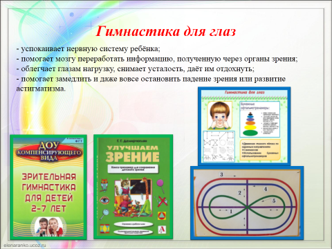 Часто врачу-офтальмологу приходится заменять детям некоторые общие физические упражнения по причине низкой остроты зрения, поэтому движения во время физкультминуток проводятся в щадящем режиме и эффективны для всех детей данной категории.