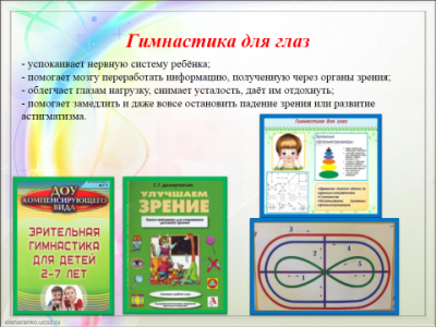 Рассмотрим более подробно тренинги для улучшения зрения, которые являются правилом жизнеобеспечения ребёнка с нарушением зрения. Зрительные гимнастики способствуют укреплению глазных мышц, снятию дополнительного напряжения, активизации кровоснабжения глаз, поступлению в ткани глаз достаточного количества кислорода. В работе с детьми с расстройствами зрительной системы используются следующие методики работы: