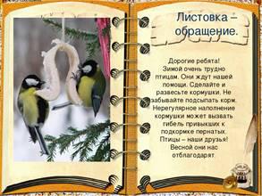 В рамках проведения акции организуется экологическое исследование «Птицы нашего края», в процессе которого дети уточняют представления о перелетных и зимующих птицах, собирают информацию о зимующих птицах нашего края. Вместе с детьми создали плакаты, рисунки, буклеты, рассказали детям младших групп о необходимости помогать нашим пернатым друзьям в тяжелый для их жизни зимний период. Совместно с родителями воспитанники проектируют и изготавливают кормушки, заготавливают корм.