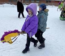 Второй день носит название «заигрыш» и ребятам предлагается подумать над корнем этого слова, определить, чем мог быть интересен этот день. И, несомненно, дети приходят к выводу, что в этот день начинались игры и гулянья. А от ведущих праздничного мероприятия ребята узнают, что чучело Масленицы на рассвете вывозили на центральное место, где затем вокруг него водились хороводы. А еще все празднующие катались с гор, на тройках лошадей, строили и защищали снежные крепости. На улицах попадались большие группы ряженых, в масках, разъезжавших по знакомым домам, где устраивались веселые домашние концерты. Всё это происходило под весёлое пение частушек.