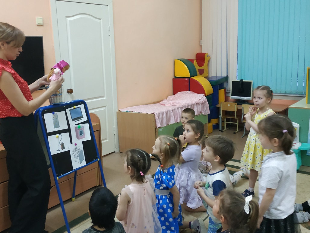 Оборудование: предметные картинки с изображением бытовой техники, игрушечная стиральная машинка, кукла Маша, корзинка с «грязным бельем».