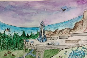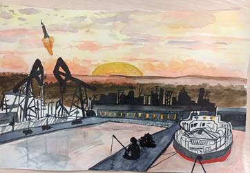 На этом рисунке образ Европейского Севера более суров. Мурманский порт, судно, возможно, это даже ледокол. Рыбак (биологические ресурсы морей), вышки нефтенасосных станций и спутник, запущенный с космодрома.