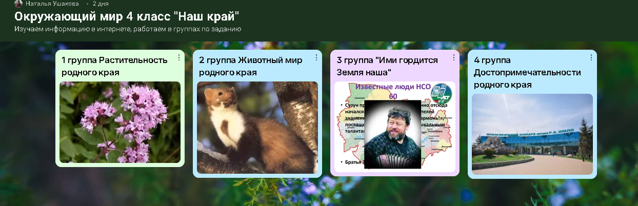 В групповой работе на многих предметах также использую ресурсы интернета. В связи с этим интересное для меня открытие – идея использования онлайн-досок для командных проектов, например, PADLET. Разрабатывая урок по окружающему миру по теме «Наш край», можно воспользоваться доской padlet. В сети Интернет создаю онлайн-доску, на которой располагаю визуальные заметки с названием одного из направлений и подробной инструкцией совместной работы. Учащиеся, договариваясь в группе, подготавливают материал в соответствии со своей ролью и заданием. Затем каждый участник проекта может дополнить общий проект своим материалом, разместив по ссылке на онлайн-доске: картинки, фото, плакаты, краткую информацию, ссылки. Учащиеся дистанционно, в совместном доступе в данном интернет-ресурсе могут добавлять также комментарии размещённым материалам других групп. На презентации группового проекта учащиеся защищают совместный проект. Рефлексируя, обсуждают процесс и результат совместной работы.