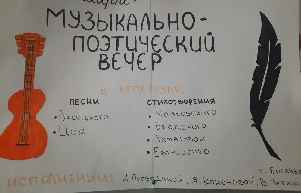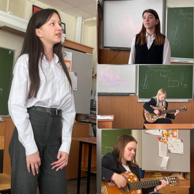 «Поэтический вечер сопровождался не только стихами вышеупомянутых авторов, но и музыкальными произведениями. Каких эмоций стоит «Утренняя гимнастика» В. Высоцкого! «Мне посчастливилось спеть три песни, душевная атмосфера, замечательный класс и учителя, играя на гитаре – чувствовала поддержку со стороны моих одноклассников, кто-то подпевал…» (Проводина Ира).