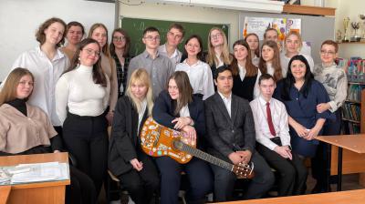А кто не знает песни «Александра» (из кинофильма «Москва слезам не верит»)? И она прозвучала на нашем мероприятии. «Мне удалось выступить с гитарой, а класс подпевал мне, я бы хотела, чтобы такие форматы уроков проходили чаще, ведь это помогает лучше понять тему и замечательно провести время с классом» (Кононова Яна).