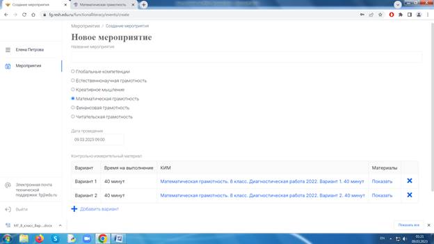 Выбираем нужный вид функциональной грамотности, например, математическую грамотность, указываем КИМ: