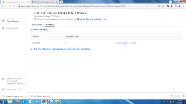Далее необходимо на вкладке «Эксперты» добавить эксперта и скачать перечень индивидуальных кодов доступа экспертов.