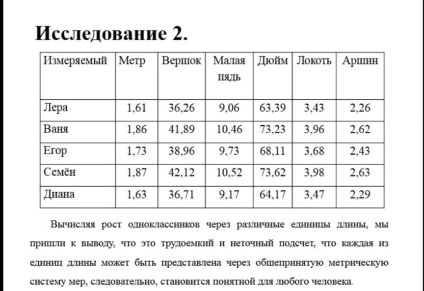 Вычисляя рост одноклассников через различные единицы длины, мы выяснили, что это неточный подсчет, и что нужно использовать общепринятую метрическую систему мер.