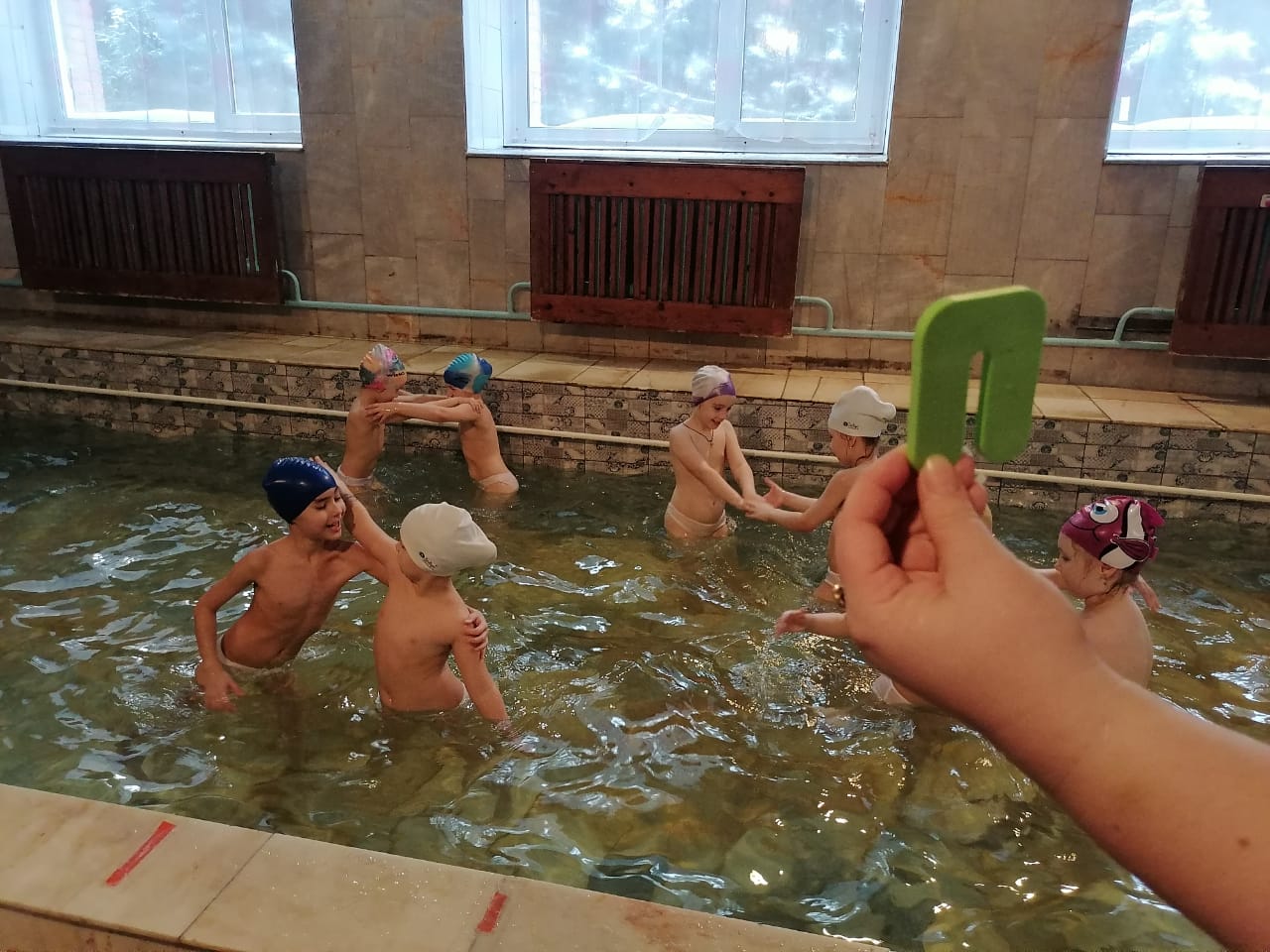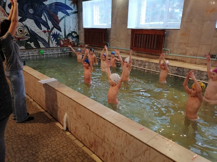 1. Ходьба (по ширине бассейна, до противоположного бортика) в шеренге, взявшись за руки, высоко поднимая колени из воды.