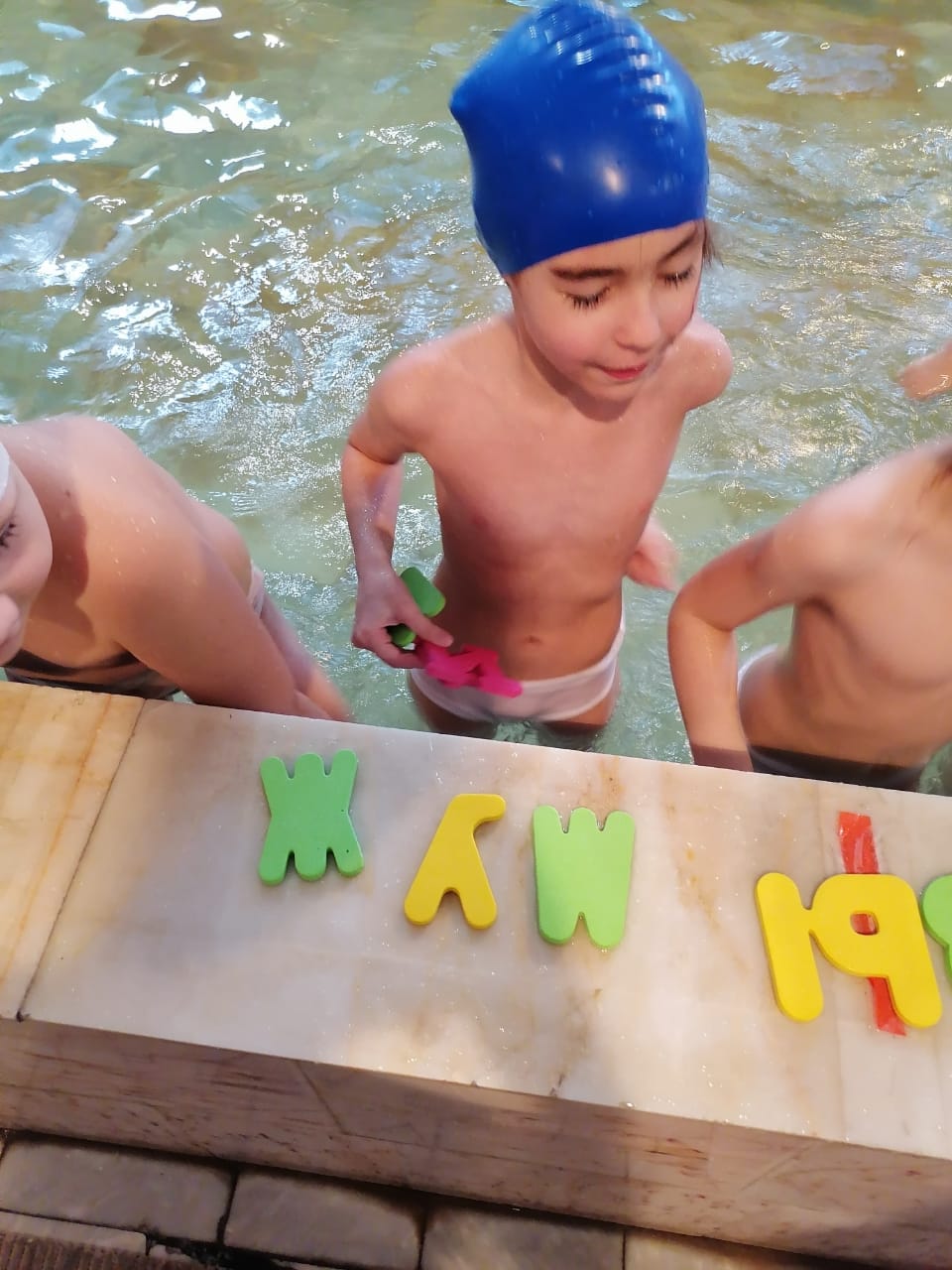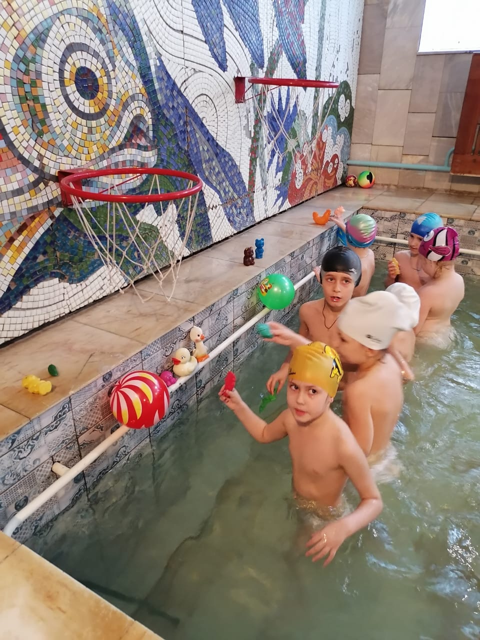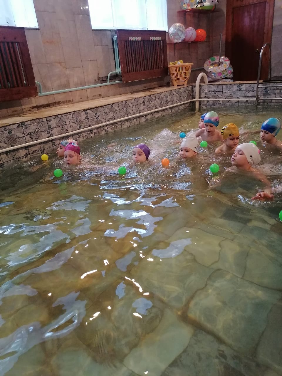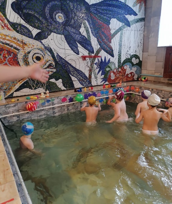 Оборудование: цветные пластмассовые шарики, доски для плавания, мячи синего, зеленого и красного цвета, буквы, игрушки пластмассовые, игрушки силиконовые, обручи.