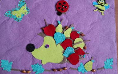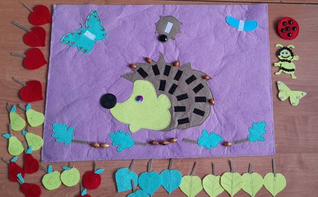 Опираясь на данные понятия, для более успешного развития активного словаря детей, автоматизации шипящего звука [Ж] мной было изготовлено панно «Весёлый ёжик». Данное пособие выполнено из фетра размером 50 см х 35 см и является многофункциональным, помогает развивать представления ребёнка о цвете, форме, величине. В центре композиции расположился большой ёж с прочными ягодками на иголках. На его иголки мы можем закрепить разнообразные листья, фрукты. Выбор происходит в зависимости от лексической темы или от развития лексико-грамматических категорий на занятии. Для этого изготовлены листья разные по цвету (желтые, красные и зеленые), разные по форме. В комплекте есть фруктовые плоды – желтые и красные груши и яблоки. На этой композиции сверху находятся разъёмные насекомые: бабочка, божья коровка и пчела. Внизу – фиксированные жёлуди и дубовые листья.
