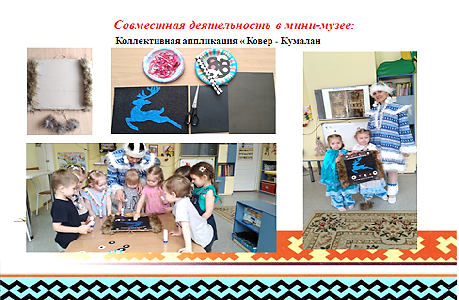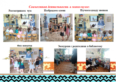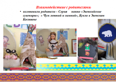 Родители со своими детьми изготовили дома различные экспонаты для мини-музея: панно «Эвенкийские сувениры», «Кукла в эвенкийском костюме», «Чум зимний и летний», шаманский бубен, амулеты эвенков и т. д. Это способствовало стимулированию познавательной активности детей, сблизило родителей и детей, сделало их настоящими партнёрами.