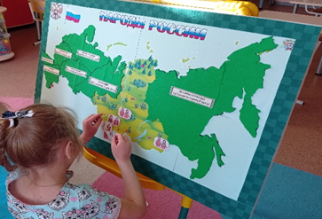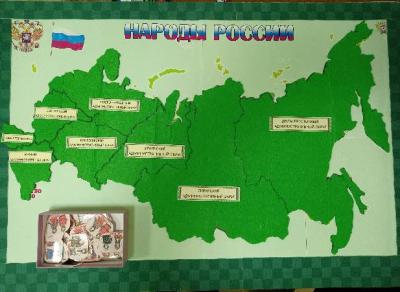 Для развития представлений детей о территориальных масштабах нашей страны, о народах, проживающих на территории России, было разработано дидактическое пособие «Карта народов России». Для наших детей это дидактическое пособие является начальной точкой при изучении народов, проживающих на территории России, оно предназначено для детей старшего дошкольного возраста. Работа с этим пособием рассчитана на два года. Основа этой дидактической игры магнитная. На начальном этапе дети видят на карте только огромную территорию нашей страны, окрашенную зеленым цветом. Под этим верхним слоем зелёной карты находится ещё одна карта, на которой ребята обнаруживают метки, которые определяют последовательность изучения карты, это позволяет воспитанникам, после соотнесения их с такими же метками на предложенных информационных картинках, определить, какую именно надо выбрать, и с помощью воспитателя изучить, какие народы проживают на данной территории нашей страны, их быт, традиции, интересные факты. Также предусмотрены игровые задания для самостоятельного изучения и игр. Вся зелёная карта разделена на федеральные округа. Работу по знакомству с представителями разных народов мы начинаем с изучения территории, на которой находится наш город, область, регион – Сибири. В одном федеральном округе проживает несколько представителей разных этнических народов, поэтому знакомство ребят с народами данной территории идёт постепенное. Сначала изучаем быт, культуру, традиции одного народа, потом других.