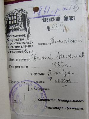Удостоверение члена Общества политкаторжан и ссыльнопоселенцев Е. Н. Пославского
