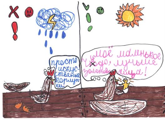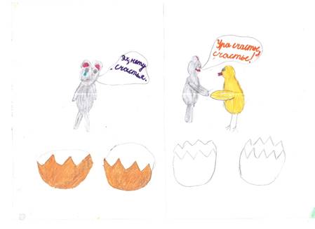 Работа со сказкой не заканчивается на уроке, она продолжается дома: ученики должны обсудить с родителями (ценность семьи) текст сказки, а родители – дать совет по выбору яйца. На следующем уроке дети рассказывают, какое яйцо посоветовали выбрать родители и почему. Советы родителей тоже разнообразные, например, бывают и такого содержания: «Курочка глупая, несла бы золотые яйца», «Бабка с Дедом глупые: продали бы яйцо, купили бы курятник». И здесь следует продолжить разговор о том, что принято считать золото большой ценностью. Бабка и Дед – глупые, они выбрали золото как металл, но ведь в старости золото не будет иметь значения. Не в золоте счастье. Да и зачем в деревне золото? Что в нашей жизни золото? (Золотые руки, золотое сердце). А в простом яйце – Жизнь. Вот это настоящее золото.