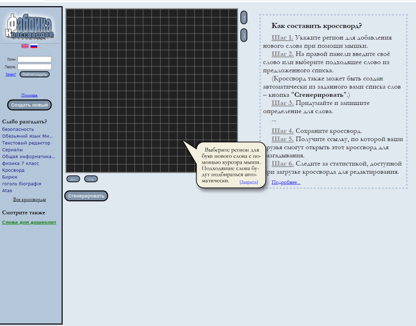 4. Фабрика кроссвордов http://puzzlecup.com. Конструктор для создания кроссвордов онлайн позволяет составить кроссворд самостоятельно или с помощью специального сервиса, разгадывать в режиме онлайн. После того как кроссворд создан, под рабочим полем появляется ссылка для разгадывания и электронный адрес странички, который можно отправить учащимся, коллегам, друзьям. Кроссворд может составить как учитель, так и ученик, в любом случае будут развиваться умения читательской грамотности – работа с информацией (выбор, анализ, оценка) включена априори. Сервис хорошо интегрируется в уроки всех предметных областей и воспитательные события любой тематики.