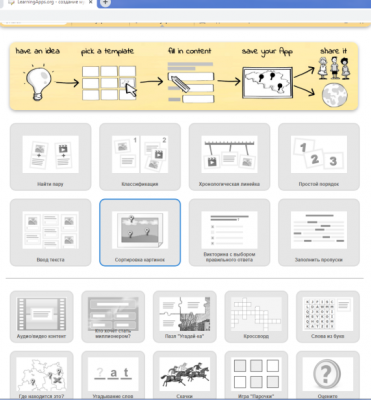 3. Платформа для создания интерактивных упражнений https://learningapps.org/createApp.php. Генератор позволяет создавать различные виды заданий для обучающихся: хронологическая линейка, найти пару, классификация, заполнить пропуски, таблица соответствий и др. Очевидно, что большую часть заданий можно использовать для формирования читательской грамотности, так как их выполнение направлено на становление ее основных умений. Учитель создаёт задание, а обучающиеся через ссылку или QR-код открывают его и выполняют. На сайте также можно воспользоваться готовыми работами.